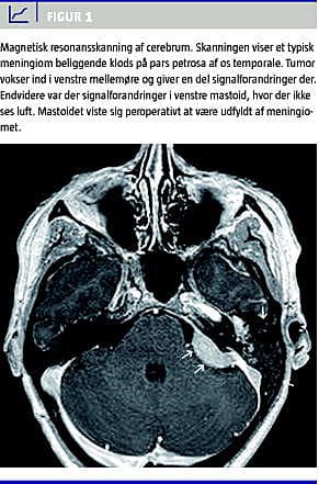 På grund af tumormistanke udførtes en computertomografi (CT) af mastoid og mellemøre, hvilket gav mistanke om en destruktiv proces i venstre mellemøre. Supplerende magnetisk resonans (MR)-skanning af mellemøre og cerebrum viste, at det drejede sig om en typisk meningiomlignende destruktiv proces langs venstre pars petrosa, der udgik fra meatus acusticus internus (Figur 1 ). Ved eksplorativ tympanotomi fandtes tumormasser i venstre mellemøre og perforation ind mod mastoidet, destruktion af den inderste del af bagerste øregangsvæg samt tegmen tympani. Biopsier af tumor viste, at det drejede sig om et meningiom. Patienten blev efterfølgende henvist til neurokirurgisk afdeling med henblik på et fælles indgreb.
