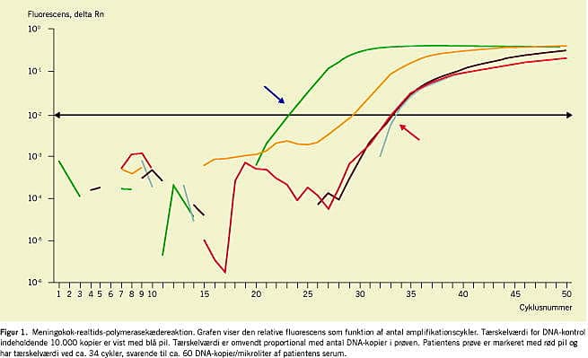 En tidligere rask toårig dreng blev indlagt med mistanke om MS. Få timer før ankomst til skadestuen fik patienten høj feber, opkastninger og tiltagende udslæt med petekkier. Han var ikke nakke/rygstiv eller bevidsthedspåvirket. Ved ankomsten blev der efter bloddyrkning givet benzylpenicillin 5 MIE intravenøst (i.v.), og efterfølgende blev der foretaget lumbalpunktur, med udtømmelse af klar væske, som var biokemisk upåfaldende. Paraklinisk fandtes der leukocytose op til 20,4 × 109 /l, C-reaktivt protein var ved ankomsten 52 mg/l stigende til 120 mg/l. En otoskopi viste normale forhold. Patienten blev indlagt på en intensivafdeling og sat i behandling med meropenem 40 mg/kg givet i.v. tre gange i døgnet, indtil ætiologien kunne afklares. Der blev endvidere givet aktiveret protein C-infusion og AT3 pga. koagulationspåvirkning. I en blodprøve taget ved ankomsten efter behandlingen var påbegyndt, blev der påvist N. meningitidis -DNA svarende til ca. 60 DNA-kopier/mikroliter af patientens serum (Figur 1 ). Undersøgelsen, der blev udført på spinalvæsken, var negativ. Molekylærbiologisk gruppebestemmelse foretaget på serumprøven viste N. meningitidis serogruppe C. Dyrkninger fra spinalvæske og petekkier, blod samt fra svælgpodning var negative efter hhv. fire, syv og to døgn. Behandlingen blev skiftet til penicillin, og patienten fik i alt seks dages antibiotisk behandling. Diagnosen blev yderligere bekræftet 14 dage senere af en signifikant titerstigning i meningokokantistoftiter (MAT), fra negativ til positiv styrkegrad 6. Barnet blev udskrevet uden sequelae.