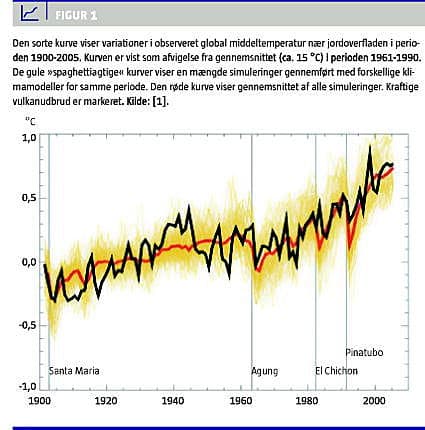 Som et vigtigt bidrag både til forståelsen af det sorte kurveforløb i Figur 1 og til verifikation af klimamodeller præsenteredes i [1] resultater fra modelsimuleringer af klimaet i 1900-tallet. Hver model blev i løbet af simuleringen »fodret« år for år med oplysninger om øjeblikkeligt indhold af drivhusgasser samt tilsvarende information om estimerede menneskeskabte udslip af partikler og naturligt varierende påvirkninger fra vulkaner og solen. Figur 1 er en af de vigtigste i [1] rapporten, og den viser, at man i store træk er i stand til at forklare det observerede temperaturforløb med de samme klimamodeller, der benyttes til simuleringer af fremtidens klimaændringer. Det bemærkes, at hvis modellerne udelukkende påvirkes fra vulkaner og sol, bliver temperaturforløbet ganske anderledes og uden den store generelle temperaturstigning.