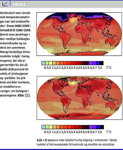Reference [1] indeholder et væld af analyser af fremtidens klimaændringer, der er simuleret ved hjælp af klimamodeller under antagelse af forskellige økonomiske, teknologiske og politiske udviklinger i verden. Figur 2 viser beregnede ændringer i temperatur ifølge special report on emissions scenario (SRES) A1B i årene 2080-2099 i forhold til 1980-1999. SRES A1B-scenariet har en fortsat vækst i både befolkningstal og emissioner frem til 2040-50 efterfulgt af en reduktion i begge størrelser. Der indføres løbende en blanding af nye teknologier. Figuren viser, at den største opvarmning sker om vinteren på høje nordlige breddegrader samt over kontinenterne. Tilsvarende kort (ikke vist her) viser, at nedbøren generelt aftager i områder, hvor det allerede er tørt. Både med hensyn til temperatur og nedbør synes Syd- og til dels Mellemeuropa udsat for kraftig opvarmning og udtørring, specielt om sommeren. Dette er et signal, der er ganske udbredt »enighed om« blandt de forskellige modeller.