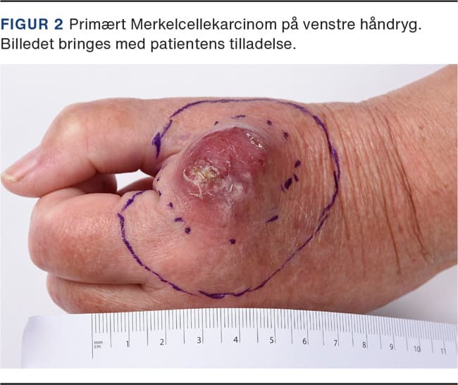 Merkelcellekarcinom (MCC) er en sjælden og aggressiv neuroendokrin hudkræft. Ca. en tredjedel af patienterne har metastatisk sygdom på diagnosetidspunktet [1]. De seneste væsentlige forskningsresultater omfatter opdagelsen af Merkelcellepolyomavirus (MCV) som ætiologisk agens og behandlingsmuligheder med immunterapi [2, 3]. På denne baggrund blev der i 2018 dannet en dansk multidisciplinær MCC-interessegruppe, der har udarbejdet den første nationale vejledning for behandling af MCC [4].
