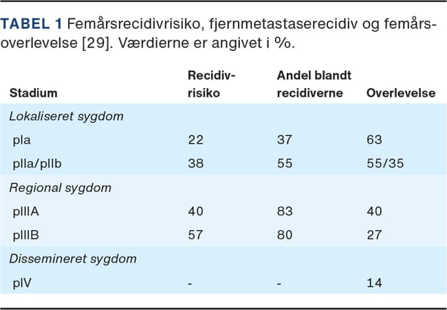 Patienter med MCC har høj risiko for tilbagefald og dårlig prognose (Tabel 1). Tilbagefald ses hos hver tredje patient, og en stor andel af tilbagefaldene er fjernmetastaser, selv hos patienter der initialt havde lokaliseret sygdom [29]. Femårsoverlevelsen er 50% ved lokaliseret sygdom og falder til 13,5% for patienter med dissemineret sygdom. I alt 90% af tilbagefaldene sker inden for de første to år [1].
