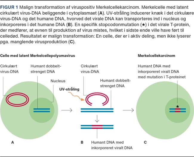 Patogenesen ved malign transformation er forskellig for viruspositiv og virusnegativ MCC. Virusnegativ MCC opstår ved længevarende UV-induceret DNA-skade. Disse tumorer har derfor et højt antal UV-associerede DNA-mutationer, særligt i tumorsuppressorgener (RB1, TP53), hvilket fører til ukontrolleret celledeling [6]. Udvikling af viruspositiv MCC kræver to uafhængige hændelser (Figur 1): 1) Det cirkulære virale DNA beliggende i cytoplasmaet skal åbnes og inkorporeres i værtscellens DNA, og 2) der skal findes en specifik stopcodonmutation i det virale T-protein, der normalt aktiverer både celledeling og viral replikation. Mutationen medfører, at proteinet ikke længere kan inducere viral replikation, hvilket ellers ville føre til celledød [2].