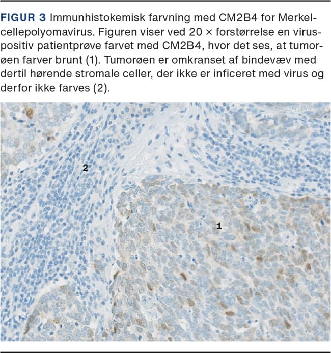 Den kliniske diagnose er ofte vanskelig at stille pga. den uspecifikke præsentation og sygdommens sjældenhed [10]. Der er ofte tale om en hurtigtvoksende, fast, uøm nodulær rød-lilla tumor, som udvikler sig eksofytisk og differentialdiagnostisk ligner mange maligne og benigne tumorer (Figur 2). Den endelige diagnose stilles på en biopsi, hvor MCC er kendetegnet ved karakteristisk histologi og immunhistokemi (positiv cytokeratin 20, negativ tyroid transkriptionsfaktor-1) [4]. Da MCC kan være vanskelig at diagnosticere, er man på enkelte centre i Danmark begyndt at supplere med en ny immunfarvning (CM2B4), der binder til MCV (Figur 3). Den patologiske differentialdiagnose er først og fremmest kutan metastase fra småcellet lungekræft.