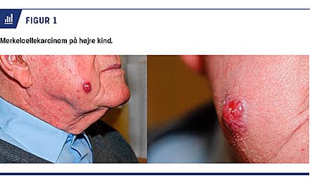 afdeling med et biopsiverificeret MCC på højre kind (Figur 1). Han havde seks måneder forinden fået curreteret et element i samme område. Dette element var histologisk blevet diagnosticeret som et basocellulært karcinom (BCC). Han var tidligere hudrask, i det væsentlige rask og i velbefindende uden gener fra B-symptomer. På højre kind fandtes en tumor, der målte lidt over 1 cm i diameter og ikke var adhærent til underliggende strukturer. Desuden palperedes der en lymfeknude lige under kæben, ca. 2 cm fra karcinomet. Patienten gennemgik excision af MCC i 2 cm’s afstand og ned til fascieniveau. Samtidig foretog man højresidig øvre halsglandeleksairese. Histologisk undersøgelse