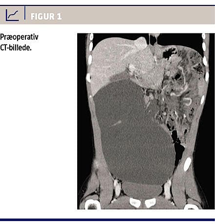 En UL-skanning suppleret med en CT (Figur 1) viste en stærkt dilateret cystisk struktur på 14 cm i diameter i højre side af abdomen, mens tarmpakettet var displaceret opadtil mod venstre, og mesenteriet tilsyneladende var torkveret 360 grader i retning mod uret. Ved akut laparotomi fandt man i tyndtarmskrøset en 25 × 15 cm stor cyste med en tyndtarmsslynge liggende fladtrykt og afklemt hen over midten (Figur 2). Cysten blev excideret in toto med samtidig resektion af det involverede tyndtarmssegment (15 cm), og den øvrige tarm blev detorkveret og genanbragt anatomisk intraabdominalt. Det postoperative forløb var ukompliceret, og drengen blev udskrevet på den tredje postoperative dag med genetableret normal tarmfunktion.
