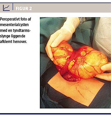 Fraset ovariecyster er intraabdominale cyster sjældent forekommende og kun sparsomt omtalt i litteraturen, ofte i kasuistisk form. Cysterne ses hos patienter i alle aldre, men hyppigst hos børn [1], og angives at være årsagen til indlæggelse hos et ud af 20.000-30.000 børn, der bliver indlagt på hospital [1]. Cysterne kan være lokaliseret i mesenteriet, omentet eller retroperitonealt; alle disse strukturer har samme embryologiske oprindelse. Hos børn ses mesenterialcyster langt hyppigst i tyndtarmsmesenteriet [1-4]. Symptomerne er ukarakteristiske mavesmerter (hos 60-90% [1, 3, 4]) eller abdominaldistention (hos ca. 50% [1, 3]), men tilstanden kan også ses som akut abdomen pga. cysteruptur, blødning, volvolus eller kompression af cystenære organer [3]. Fordi tilstanden er sjælden, og symptomerne er ukarakteristiske, blev diagnosen tidligere hyppigst stillet ved operation (> 60% [1, 4]), men i dag kan diagnosen med stor sikkerhed stilles ved UL-skanning eller CT, [5] og i et stigende antal tilfælde er diagnosen fastlagt præoperativt.