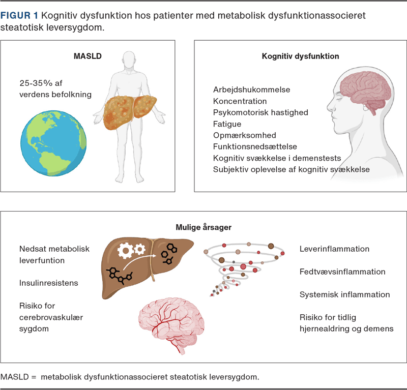 MASLD bør betragtes som en multisystemisk sygdom, da mange organsystemer er påvirkede af den metaboliske dysfunktion og påvirker hinanden indbyrdes. Tilstedeværelse af hver af de kardiometaboliske forstyrrelser øger risikoen for udvikling og progression af MASLD, og modsat øger MASLD selvstændigt risikoen for type 2-diabetes og kardiovaskulær sygdom [2]. I de seneste år er der kommet fokus på samspillet mellem leveren og hjernen ved MASLD, fordi flere studier har påvist kognitiv dysfunktion i patientgruppen – i nogle studier endda uafhængigt af øvrige kardiometaboliske risikofaktorer. En velkendt komplikation til levercirrose er hepatisk encefalopati (HE), som skyldes svigt af leverens metaboliske funktion og/eller portosystemisk shuntning [3]. Det overraskende ved studierne af patienter med MASLD er, at hjernens funktion kan være påvirket i selv de tidlige stadier af sygdommen, før der opstår fibrose og levercirrose.