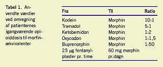 En rotationsratio på 10:1 viste sig at være et sikkert udgangspunkt til denne patientgruppe uanset dosis af tidligere opioid, idet ingen alvorlige bivirkninger blev registreret. Det, at omlægningen foregik i ambulant regi, krævede god forberedelse af patienten og tæt opfølgning de første 2-3 uger mht. titrering. Bivirkninger var hyppigt forekommende, især hos opioidnaive, hvoraf 76% ønskede seponering af denne årsag allerede på en lav dosis. Hos ikkeopioidnaive var seponeringsfrekvensen pga. bivirkninger lavere, 24% (Tabel 2). Hyppigste bivirkning hos opioidnaive var svimmelhed og hos ikkeopioidnaive sløvhed. Kvalme og svedtendens var også relativt hyppigt forekommende.