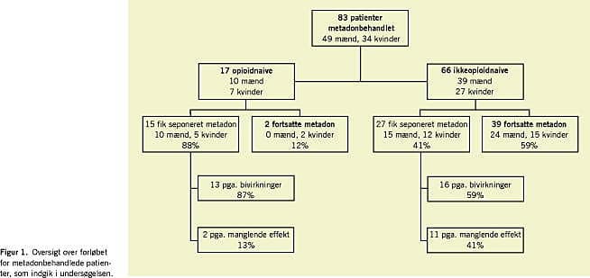 Resultater: Blandt de patienter, der havde fået medicineringen omlagt, opnåede 59% god smertelindring på metadon med en døgndosis på 20,5 (spændvidde: 1,5-82,5) mg, seponeringsfrekvensen var 24% pga. bivirkninger og 17% pga. manglende effekt. Blandt opioidnaive patienter opnåede 12% god smertelindring på en døgndosis på 3,75 (spændvidde: 3,5-4) mg. Her forårsagede bivirkninger seponering i 76% af tilfældene og manglende effekt i 12% af tilfældene.