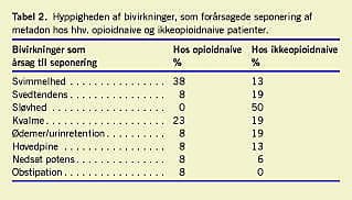 Bivirkninger, som foranledige de seponering, fremgår af Tabel 2 . I alt 15 ud af 17 opioidnaive (88%) ophørte med metadon, 13 ud af 15 (87%) pga. bivirkninger og to ud af 15 (13%) pga. manglende effekt. Den maksimale døgndosis på seponeringstidspunktet for denne gruppe var 12 mg. Ingen af disse 15 påbegyndte behandling med et andet opioid. To (12%) af de opioidnaive fortsatte metadonbehandling i en døgndosis på hhv. 3,5 mg og 4 mg.