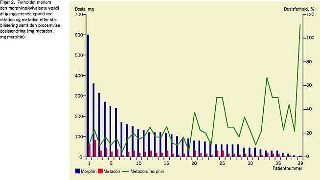 Niogtredive (59%) af de patienter, som blev roteret til metadon fra et andet opioid, angav at have fået bedre smertelindring og ingen eller tolerable bivirkninger og var fortsat i metadonbehandling ved afslutning af behandlingsforløbet i Smertecentret. Den morphinækvivalente døgndosis af tidligere opioid var mediant 117 (spændvidde: 5-600) mg, og metadondosis ved stabilisering var mediant 20,5 (spændvidde: 1,5-82,5) mg, en ratio mellem morphin og metadon på 6:1 (22,7:1-1,1:1) efter titrering (Figur 2 ). Den nødvendige titreringsperiode var maksimalt tre uger.