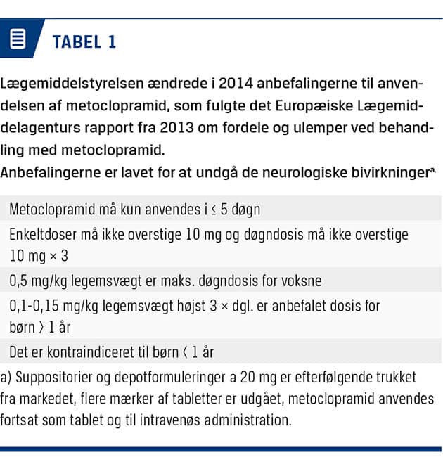 I 2013 ændrede Det Europæiske Lægemiddelagen-tur anbefalingerne for brugen af metoclopramid (Tabel 1). Man må kun anvende metoclopramid i fem dage ad gangen, kumuleret i maksimalt tre måneder. Som ordinerende læge har man pligt til at være opmærksom på mulige neurologiske bivirkninger, som patienten skal informeres om forud for behandlingsstart.