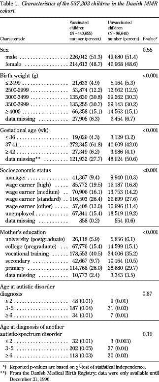 Tabel 1 viser kohorten opdelt efter vaccinationsstatus, køn, fødselsvægt, gestationsalder, socioøkonomisk status for familien, moderens uddannelse og barnets alder ved diagnosticeringen. Gennemsnitsalderen ved diagnosetidspunktet var fire år og tre måneder for infantile autister, mens gennemsnitsalderen for børn med andre udviklingsforstyrrelser i det autistiske spektrum var fem år og tre måneder. Den gennemsnitlige alder ved MFR-vaccinationen var 17 måneder, og 98,5% af børnene blev vaccineret inden treårsalderen. Der var ingen kønsforskel i tilslutningen til MFR-vaccinationen.