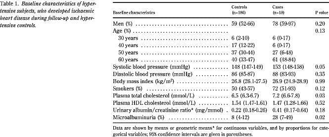 Mikroalbuminuri var til stede hos 28% (95% konfidensinterval 7-49%) af dem, som senere udviklede iskæmisk hjertesygdom, men kun hos 8% (4-12%) af dem, som ikke udviklede iskæmisk hjertesygdom (χ2 : p=0,02) (Tabel 1 ). Deltagere, som udviklede iskæmisk hjertesygdom, var endvidere karakteriserede ved højere systolisk blodtryk (153 [95% konfidensinterval 148-158] mmHg versus 148 [147-149] mmHg; Students t-test: p=0,05, og totalkolesterol 7,2 [6,6-7,8] mmol/l versus 6,5 [6,3-6,7] mmol/l; Students t-test: p=0,03) end dem, som ikke udviklede iskæmisk hjertesygdom (Tabel 1).