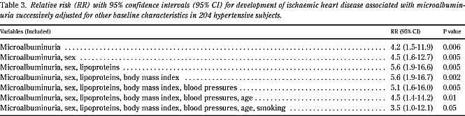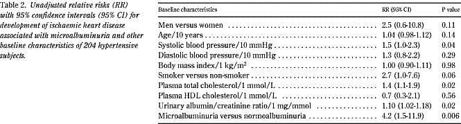 Results: Over 1978 person-years, 18 participants (9%) developed ischaemic heart disease. Microalbuminuria, defined as a urinary albumin/creatinine ratio above the upper decile in the hypertensive population under study (1.07 mg/mmol), was the strongest predictor of ischaemic heart disease with a relative risk (95% confidence interval) of 4.2 (1.5-11.9) (p=0.006). When adjusted for all other variables, including age and sex, the relative risk was 3.5 (1.0-12.1) (p=0.05).