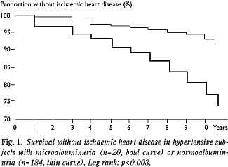 Discussion: Microalbuminuria is associated with a fourfold increased risk of ischaemic heart disease in subjects with untreated hypertension or borderline hypertension. Urinary excretion of albumin should perhaps be monitored regularly in the hypertension clinic, and rigorous control of blood pressure and other modifiable atherosclerotic risk factors is to be recommended in hypertensive patients with microalbuminuria.