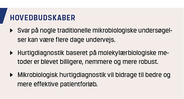 Med den teknologiske udvikling vil de klinisk mikrobiologiske afdelinger i stigende grad kunne bidrage væsentligt til både at afkorte tiden til udredning af patienter for akutte infektioner og afklare en eventuel bærertilstand af resistente bakterier, og dermed kan patienterne potentielt komme hurtigere ud af isolation.