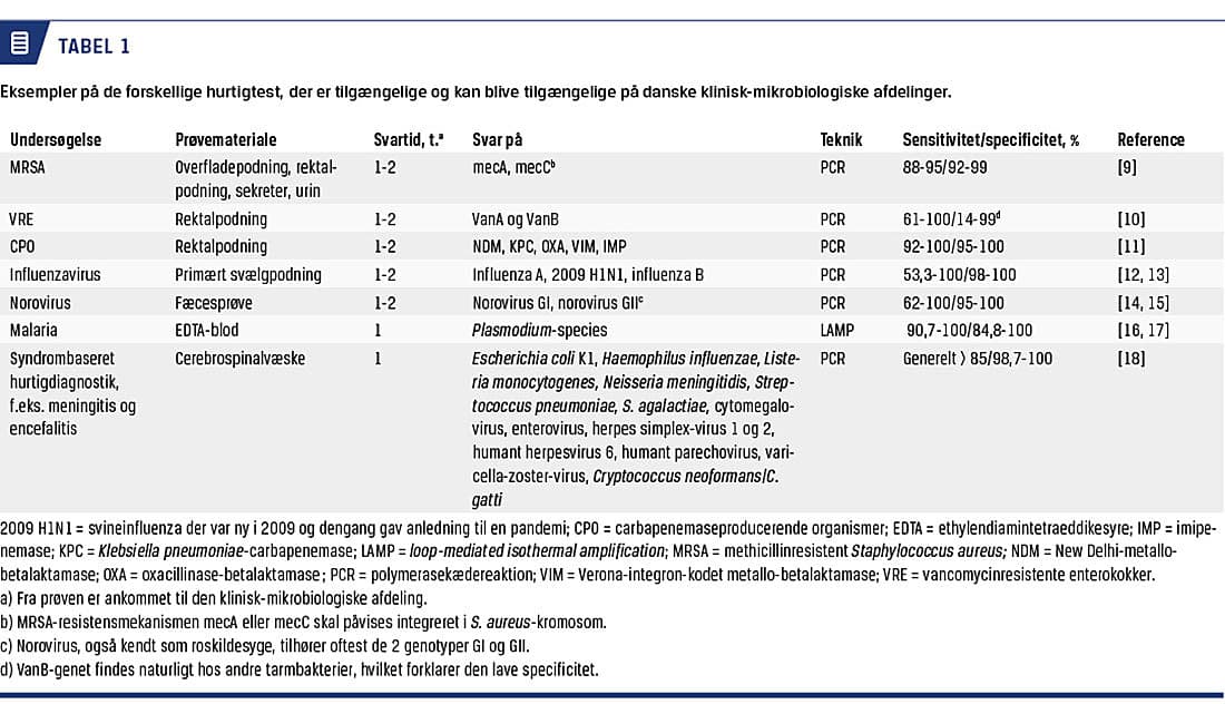 Med indførelse af hurtigdiagnostik til screening (polymerasekædereaktion (PCR)-test direkte på podninger) for MRSA, VRE og CPO kan laboratorietiden skæres ned til 1-2 timer (Tabel 1). Med metoderne påviser man de gener, der medfører resistens.