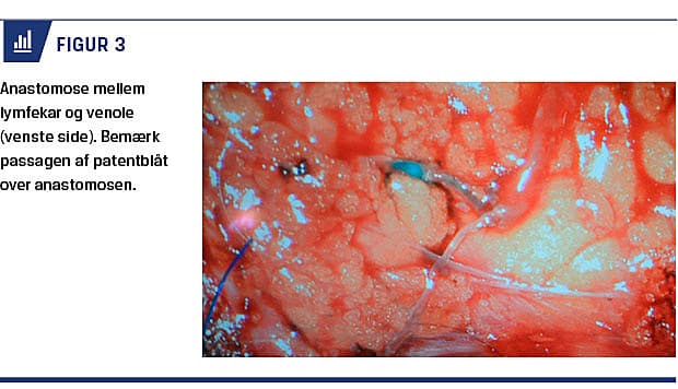 Ved en lymfovenøs anastomose sys lymfebaner og venoler sammen, så lymfevæsken kan løbe over i blodbanen. I løbet af de seneste ti år er der rapporteret om forbedrede resultater med lymfovenøse anastomoser [10-15]. Det skyldes større viden om lymfesystemets funktion og anatomi samt en forståelse af, at der kræves flere (op til ti) anastomoser på hver ekstremitet med lymfødem for effektivt at aflaste ekstremiteten og opnå varige resultater (Figur 3). Udviklingen af nyt apparatur og injektion af indocyaningrønt muliggør visualisering og lokalisering af fungerende lymfebaner. Ofte benyttes mere end et mikroskop ad gangen for
