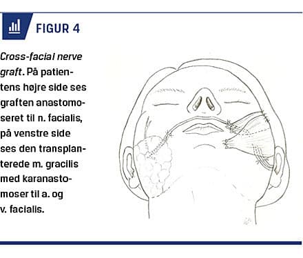 af skeletmuskulatur, som kan skabe et træk og derved genskabe kontrollerede og emotionelt betingede ansigtsbevægelser. Hvis paresen skyldes en central skade, kræver metoden to operationer, da nerveforsyningen til det kommende muskeltransplantat først skal etableres. Ved den første operation identificeres en eller flere n. facialis-gren(e) på den nonparalytiske side. Hertil anastomoseres en såkaldt cross-facial nerve graft (CFNG), oftest fra n. suralis, som føres subkutant over ansigtet mod den paralytiske side. Herefter afventes aksonudvækst i nervetransplantatet, og ca. 9 mdr. senere foretages der rekonstruktion med en fri muskellap, som så innerveres af CFNG (Figur 4). Skyldes paresen derimod en skade distalt for processus mastoideus, etableres nerveforbindelsen til lappen direkte til n. facialis på den paralyserede side, hvis denne findes egnet efter resektion af neurinom og evt. fibrose. Typisk benyttes m. gracilis, men andre muskler eller dele heraf kan også benyttes [16-18]. Musklen anastomoseres på recipientstedet, hyppigst til a. og v. facialis, og fikseres som regel præaurikulært og langs arcus zygomaticus og føres til mundvigen, til over- og underlæben og til næsefløjens basis med den hensigt at genskabe den nasolabiale fold. I Danmark blev denne metode første gang anvendt i 1980 med latissimus dorsi som donormuskel.