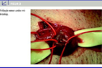 Operationen blev hos alle foretaget i universel anæstesi. Der blev foretaget en incision lige under anulus inguinalis superficialis. Funiklen og testis blev lukseret frem i feltet (Figur 1 ), og gubernaklets vener blev opsøgt og elkoaguleret. Funiklen blev frilagt og gennemgået under mikroskop, hvorved venestammerne ( Figur 2 ) kunne identificeres, deles og ligeres med resorberbar sutur. Ductus deferens, dennes karforsyning samt arteria testicularis og lymfekar blev bevaret. Operationstiden blev noteret.