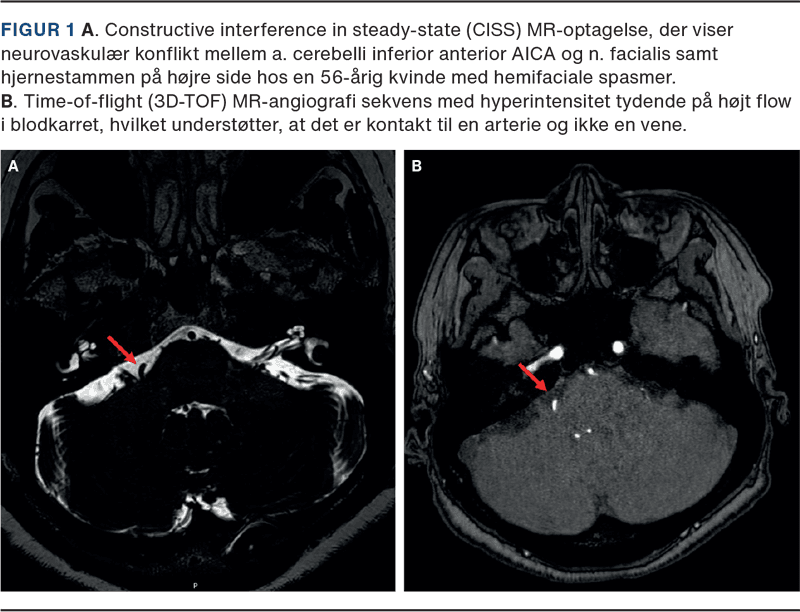 Påvisning af en eventuel strukturel årsag til symptomerne sker ved MR-skanning af hjernen og den relevante kranienerves forløb i de basale cisterner i fossa posterior. En 3 tesla 3D-T2-vægtet optagelse som constructive interference in steady-state (CISS) vil i de fleste tilfælde kunne påvise en eksisterende neurovaskulær konflikt, og 3D-time-of-flight (TOF)-MR-angiografi hjælper med at skelne mellem de relevante vener og arterier i området [1, 2]. Et eksempel på en MR-skanning med neurovaskulær konflikt mellem AICA og n. facialis hos en patient med højresidige hemifaciale spasmer fremgår af Figur 1.