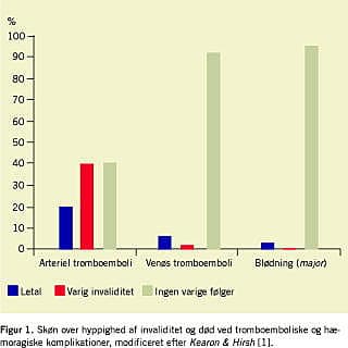 I Danmark er forbruget af antitrombotiske midler gennem en årrække steget med ca. 10% årligt. I dag får knapt en halv million danskere eller ca. 9% af befolkningen antitrombotiske midler. Ca. 80.000 får vitamin K-antagonister (VKA) og andre antikoagulantia, mens resten får trombocythæmmende midler, hvoraf ca. 370.000 behandles med acetylsalicylsyre (ASA). Antitrombotisk behandling udgør et problem ved invasive procedurer, idet opretholdelse af behandlingen i nogle situationer kan medføre blødningskomplikationer, mens pausering af behandlingen er forbundet med øget risiko for tromboemboliske komplikationer. Dette dilemma giver jævnligt anledning til diskussion mellem lægen, som har ordineret behandlingen for at forebygge tromboser, og den, som skal udføre indgrebet og står med risikoen for blødningskomplikationer. Blødningskomplikationer giver langt sjældnere end tromboemboliske komplikationer anledning til invaliderende eller letale følger (Figur 1) [1]. Ved kirurgiske indgreb på patienter i antitrombotisk behandling bør man derfor acceptere en lidt højere blødningsrisiko ved indgrebet snarere end at risikere en tromboembolisk komplikation ved pausering af behandlingen.