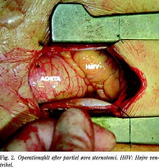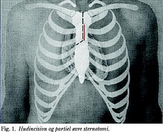 Operationen indledes med, at der laves en otte centimeter lang hudincision (Fig. 1 ). Der laves herefter en øvre partiel sternotomi, der starter fra overkanten af sternum i midtlinjen gående ud i fjerde interkostalrum (Fig. 1). De to sternumdele skilles med en lille spærre. Perikardiet deles og opsys (Fig. 2 ). Under hele proceduren ledes CO2 ned i feltet gennem en lille slange, der sys fast ved sårkanten. Efter heparinisering kanyleres aorta og højre atrium. Der bruges små kanyler (22 French begge steder). For at kunne gennemføre den ekstrakorporale cirkulation med de små kanyler benyttes vacuumassisteret kardiopulmonal bypass (CPB). Når denne er etableret, sættes der tang på aorta, og der gives antegrad kardioplegi. Vha. TEE sikres det, at venstre ventrikel ikke dilaterer.