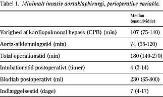 Operationstiden, perfusionstiden og aortaafklemningstiden, som beskrives i dette studie, er alle på et acceptabelt niveau og adskiller sig næppe fra standardindgrebet med fuld sternotomi. I randomiserede studier fandtes heller ingen forskel på disse tider, uanset om indgrebet blev foretaget som minimalt invasiv teknik eller med fuld sternotomi (6, 7).