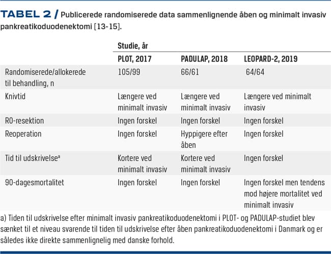 Der foreligger i alt tre randomiserede studier af laparoskopisk versus åben pankreatikoduodenektomi publiceret i henholdsvis 2017, 2018 og 2019 (Tabel 2) [13-15]. I PLOT-studiet inkluderedes periampullære maligne tumorer, mens der i PADULAP- og LEOPARD-2-studierne blev inkluderet både benigne, præmaligne og maligne tumorer. Opsigtsvækkende er det, at LEOPARD-2-studiet blev afsluttet før tid, da en interimanalyse viste øget postoperativ mortalitet i gruppen af patienter, der blev opereret laparoskopisk (fem ud af 50 laparoskopisk opererede versus en ud af 49 åbent opererede). I tillæg til ovenstående er forfatterne af indeværende artikel bekendt med i hvert fald yderligere et randomiseret belgisk studie, hvor man sammenlignede åben og minimalt invasiv pankreatikoduodenektomi. Dette studie blev påbegyndt i 2012, men af uvisse årsager afsluttet før tid i 2014 (clinicaltrials.gov NCT01712971).