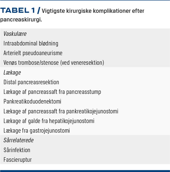Tidlige komplikationer i forbindelse med pancreaskirurgi kan inddeles i vaskulære, sårrelaterede og anastomoserelaterede, hvor sidstnævnte ikke forekommer ved distal pankreatektomi (Tabel 1). Ved distal pancreasresektion er de væsentligste komplikationer relateret til lækage fra pancreasstumpen. Frekvensen af klinisk betydende lækage fra pancreasstumpen varierer mellem 30% og 60%, stort set uafhængigt af om stumpen staples eller håndsys, og om stumpen patches [10, 11]. De vaskulære komplikationer inkluderer postoperativ intraabdominal blødning, pseudoaneurisme på a. gastroduodenale og stenose/trombose relateret til veneresektion. Lækage fra enten pankreatiko- eller hepatikojejunostomien forekommer i varierende grad og kan oftest forsørges med enten et transabdominalt eller perkutant transhepatisk dræn, mens lækage fra den gastrojejunale anastomose oftest medfører operativ intervention. Sårrelaterede komplikationer adskiller sig i store træk ikke fra øvrige intraabdominale procedurer. Den samlede reoperationsrate efter pancreaskirurgi estimeres til ca. 5% [9].