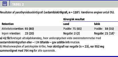 Hos 93 af 116 patienter (80%) gav sestamibiskintigrafien mistanke om en eller flere hyperfungerende kirtler. Resultatet af parathyroideaskintigrafierne set i relation til operationsfund fremgår af Tabel 2 .