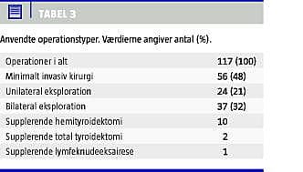 Hos 83 patienter (71%) blev der planlagt minimalt invasiv kirurgi. Ved 27 (33%) af disse opera-tioner måtte hudincisionen udvides og halseksploration foretages. Tolv patienter fik samtidig med parathyroideaoperationen også foretaget supplerende thyroideaoperation. Således fik ti patienter foretaget hemityroidektomi, to patienter fik foretaget total tyroidektomi, den ene sammen med halslymfeknudedissektion på grund af thyroideacancer. De forskellige operationstyper fremgår af Tabel 3 .