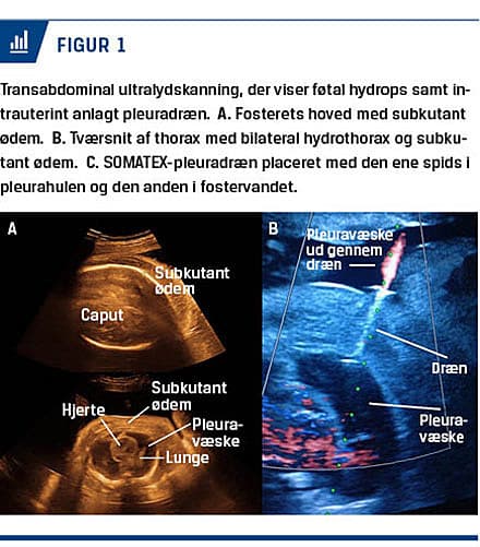 niveauer af leverenzym og urat. En UL-skanning af fosteret viste udtalt hydrops (estimeret fostervægt + 58%) med universelt subkutant ødem på 2-3 cm, svær hydrothorax, ascites og polyhydramnios (Figur 1A og B). Endvidere sås der massivt forstørret, hydrop placenta. I håb om at bedre fosterets (og dermed også moderens) tilstand, foretog man intrauterin anlæggelse af SOMATEX-pleuradræn (Figur 1C). Pga. hurtig forværring af moderens præeklampsilignende tilstand måtte man dog foretage sectio i GA 34 + 1. Ved fødslen var barnet slapt og cyanotisk med langsom hjerteaktion, uden egen respiration og med svær hydrops. Trods maksimal intensiv behandling sov barnet stille ind 17 timer efter fødslen. De første dage post partum var der påvirket biokemi hos moderen og forhøjet blodtryk. To uger efter fødslen var de maternelle symptomer aftaget.