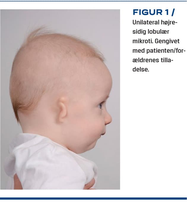 På græsk betyder mikroti lille øre og er betegnelse for et misdannet ydre øre varierende fra et mindre, næsten normalt øre til et helt manglende ydre øre (anoti) (Figur 1). Prævalensen for mikroti på verdensplan varierer fra 0,8 og helt op til 17 pr. 10.000 fødsler med den højeste prævalens i Ecuador og blandt Navajoindianerne. I Europa er den højeste rapporterede prævalens fundet i Finland, hvor den ligger på 4,3 pr. 10.000 [4, 5]. Man mener, at prævalensen i Danmark ligger på 1-2 pr. 10.000, men der er usikkerhed om dette tal, og i enkelte rapporter angives prævalensen kun at være 0,27-0,4 pr. 10.000 [5, 6]. Det er muligt, at tilstanden er underrapporteret ved de milde tilfælde af mikroti.