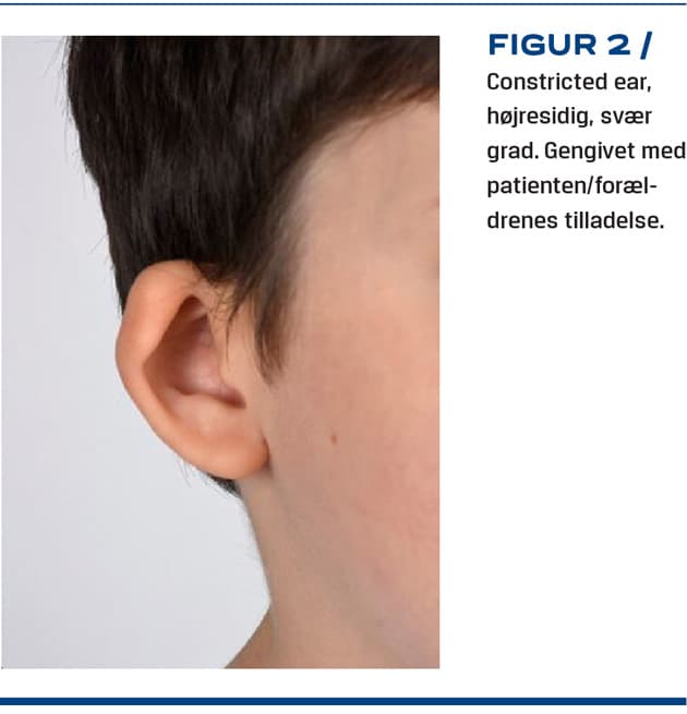 Constricted ears, også kaldet lop ears eller cup ears er en øredeformitet, som omfatter varierende grader af foldning af den øvre del af øret (inkluderende helix, scapha og antihelix) samt protrusion af øret (Figur 2). Deformiteten forekommer i meget varierende grad, og behandlingerne dækker således en bred vifte af muligheder. De mildeste typer kan behandles ved at forme øret i neonatalperioden, hvor der er beskrevet brug af diverse materialer såsom skum, plaster, skinner og plastikrammer, som bliver lagt på øret i de første leveuger. De sværeste, som kan være forandringer, der ligner mikroti, kræver subtotal aurikulær rekonstruktion, f.eks. autolog rekonstruktion med brusk. Herimellem findes deformiteter, som kræver korrektion i form af f.eks. resektion, indsættelse af brusktransplantat, V-Y-plastik og forskellige lokale lapper [11-13]. Behandlingen foretages primært i plastikkirurgisk regi.