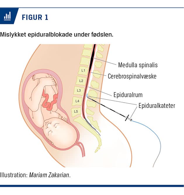 Epiduralanalgesi er indgift af et lokalanalgetikum og evt. et opioid. Anlæggelsen vil oftest ske mellem lumbalhvirvlerne L3 og L4 (Figur 1) og administreres som kontinuerlig infusion og/eller bolus. Anlæggelse bør tilstræbes, når kvinden er i aktiv fødsel, dvs. ved orificium > 4 cm, og for optimal udnyttelse af epiduralblokaden skal anlæggelsen helst ske inden orificium > 7 cm [1, 5-7]. Epiduralblokade er blevet mere udbredt igennem de seneste årtier og anlægges hos 25% af de fødende kvinder i Danmark, hyppigere hos førstegangsfødende end hos flergangsfødende [3]. Til trods for det stigende antal er der ingen konsensus om, hvordan en mislykket epiduralblokade (MEB) defineres, hvilket afspejles i et bredt incidensinterval fra 8,5% til 23%.