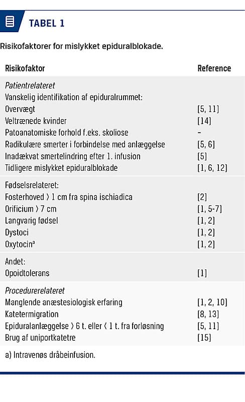 Tidligere MEB [1, 6, 12] , opioidtolerans [1] og radikulære smerter i forbindelse med anlæggelse af epiduralblokade [5, 6] er alle rapporteret som risikofaktorer.