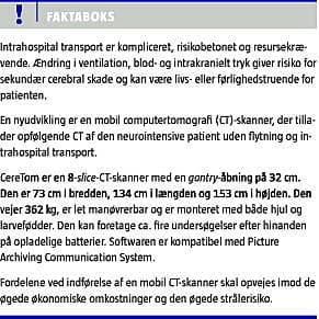 Intrahospital transport er kompliceret, risikobetonet og resursekrævende. En ny type mobil computertomografi (CT)-skanner tillader opfølgende CT af den neurointensive patient uden flytning og intrahospital transport.