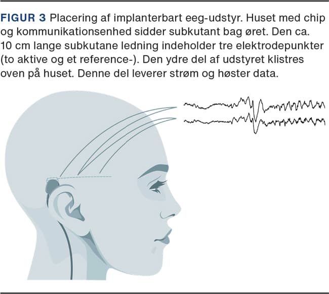 Der findes hjemme-eeg-løsninger, dels med elektroder, som placeres uden på huden, og som typisk bruges i nogle uger, dels løsninger, som ligger under huden, og som kan bruges i månedsvis. De fleste patienter oplever, at eeg-løsninger, som er uden på huden, er lidt besværlige at bruge og er meget synlige for andre [25]. Ved anvendelser af de subkutane eeg-løsninger er der behov for kommunikation med en ydre enhed, og de bliver derfor mindre elegante end loop-recorderen (Figur 3). Både den kardielle loop-recorder og den subkutane eeg-løsning kan anlægges på kort tid i lokal anæstesi. På verdensplan findes der én subkutan eeg-løsning, som er godkendt til klinisk brug (24/7 EEG SubQ-devicet), og som er udviklet af et danske firma. Udstyret har to eeg-kanaler. Det betyder, at det kun er en mindre del af hjerneaktiviteten, der kan monitoreres. Derfor er det vigtigt, at man grundigt overvejer den individuelle placering hos den enkelte patient, f.eks. vejledt af anfaldenes klinik, skanninger og markører i standard-eeg’et. Visuel vurdering af disse eeg-data som led i et dansk forskningsprojekt fra ni epilepsipatienter i op til tre måneder og fra to epilepsipatienter i op til fem måneder, gav lovende resultater.