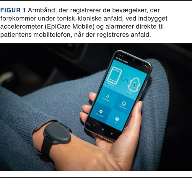 Fase 3-studier var kun tilgængelig for GTCS, herunder FBTCS. I et studie brugte man accelerometer (EpiCare) [19], i et studie brugte man overfladeelektromyografi [20], og et studie brugte man en multimodal enhed (accelerometri og puls) [18]. I studiet, hvor man anvendte accelerometer, benyttede man den danskproducerede EpiCare-enhed, som er et armbånd, der registrerer de bevægelser, der forekommer under tonisk-kloniske anfald, og alarmerer direkte til patientens mobiltelefon, når der registreres anfald (Figur 1). Sensitiviteten for de tre forskellige enheder var på 90-96% med en falsk alarmrate på 0,2-0,67/24 timer (0-0,03/nat). Alle tre enheder, der blev valideret i fase 3-undersøgelser, har godkendelse til brug som medicinsk udstyr (CE-mærke) i EU. To studier opfyldte kriterierne for fase 4-valideringsstudie med test af anvendelighed til alarmering af GTCS ved hjemmemonitorering [18, 21]. Det er imidlertid vigtigt at bemærke, at de fleste patienter, der blev inkluderet i fase 4-undersøgelserne, havde alvorlig epilepsi og intellektuel funktionsnedsættelse og boede i en plejebolig. For andre anfaldstyper var kun fase 2-undersøgelser tilgængelige.