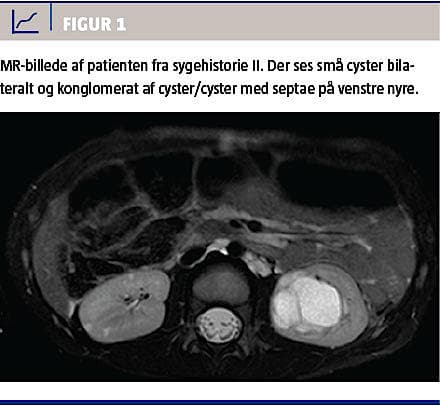 II. En tre år og fire måneder gammel dreng fik foretaget UL-skanning af nyrerne på grund af forbigående makroskopisk hæmaturi. Skanningen viste, at højre nyre havde normal størrelse med en 3,4 cm × 2,5 cm stor kortikal cyste. Venstre nyre var let forstørret med flere små cyster og et konglomerat af cyster/cyster med septae på 4 cm × 2,3 cm. Der var ikke pancreas- eller leverforandringer. UL-skanningen blev suppleret med CT og MR-skanning af nyrerne for at udelukke malignitet i cysterne (Figur 1).