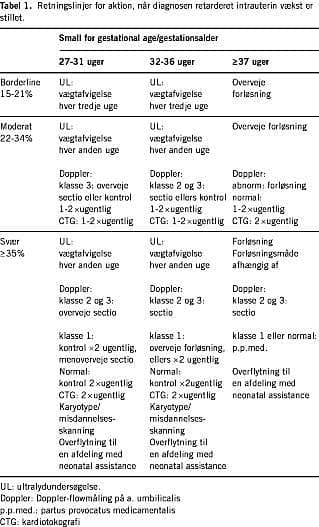 Dansk Selskab for Obstetrik & Gynækologi har udarbejdet et forslag til retningslinjer for aktion, når diagnosen retarderet intrauterin vækst er stillet (Tabel 1 ).