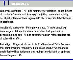 Summary Monitoring of bioavailability, pharmacokinetics and immunogenicity of tumour necrosis factor-alpha inhibitors. Ugeskr Læger 2010;172(1):44-47 Treatment of inflammatory bowel disease (IBD) with antibodies against tumour necrosis factor-alpha (TNF) is effective. Not all patients respond, however, and the effect wears off in a considerable fraction of initial responders over time. Individual differences in bioavailability, pharmacokinetics and immunogenicity are now recognized as essential problems in the use of biologicals, and blood measurements of functional anti-TNF antibodies and antibodies against anti-TNF drugs with robust and clinically relevant methods may optimize treatment of IBD through individualized therapeutic regimens.