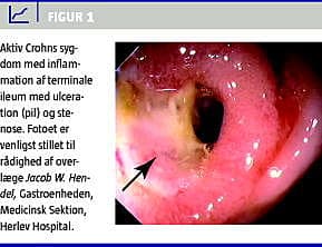 Biologiske lægemidler har revolutioneret behandlingen af kronisk inflammatorisk tarmsygdom (IBD), og de anvendes nu rutinemæssigt til behandling af patienter med ugunstigt forløb på konventionel behandling. Biologisk behandling har hovedsageligt været anvendt til patienter med Crohns sygdom (Figur 1 ), men den er også virksom hos patienter med colitis ulcerosa. I Danmark er antistoffer mod tumornekrosefaktor (TNF)-alfa den eneste klasse af biologiske lægemidler, der er registreret til behandling af IBD. Klassen omfatter den humant-murine TNF-hæmmer, infliximab, og den rent humane TNF-hæmmer, adalimumab. Infliximab har hidtil været førstevalgspræparat ved biologisk behandling af IBD, og det er den mest afprøvede TNF-hæmmer med veldokumenteret effekt.