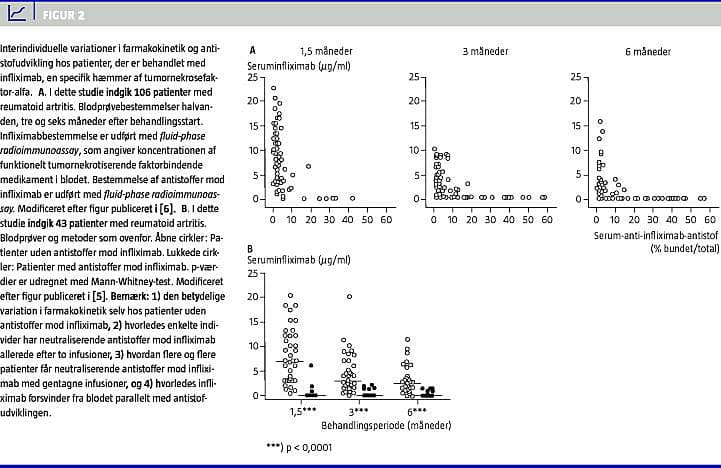 Lægemidler virker ofte forskelligt på forskellige individer. Begrebet individualized eller personalized medicine er opstået i erkendelse af dette og af vigtigheden af at give den rette medicin til den rette patient i den rette dosering og på det rette tidspunkt. Disse forhold er ikke mindst væsentlige, når det drejer sig om optimal anvendelse af de biologiske lægemidler - herunder TNF-hæmmere - til behandling af IBD og andre kroniske immuninflammatoriske sygdomme. Individualized medicine blev oprindeligt lanceret som et forsøg på at optimere og individualisere behandling af enkeltindivider vha. farmakogenetiske metoder, men efter introduktionen af proteinbaserede biologiske lægemidler anvendes begrebet mere bredt [4, 5]. Der er flere årsager hertil. Det har således vist sig, at proteinbaserede lægemidler er potentielt immunogene og kan inducere T- og B-lymfocytreaktivitet, herunder dannelse af neutraliserende antistoffer, se Figur 2A og [6]. Endvidere udviser biologiske lægemidler i modsætning til konventionelle lavmolekylære lægemidler markante interindividuelle variationer i både biotilgængelighed og farmakokinetik, hvilket ligeledes menes at forklare manglende behandlingseffekt hos visse patienter, se Figur 2B og [6].