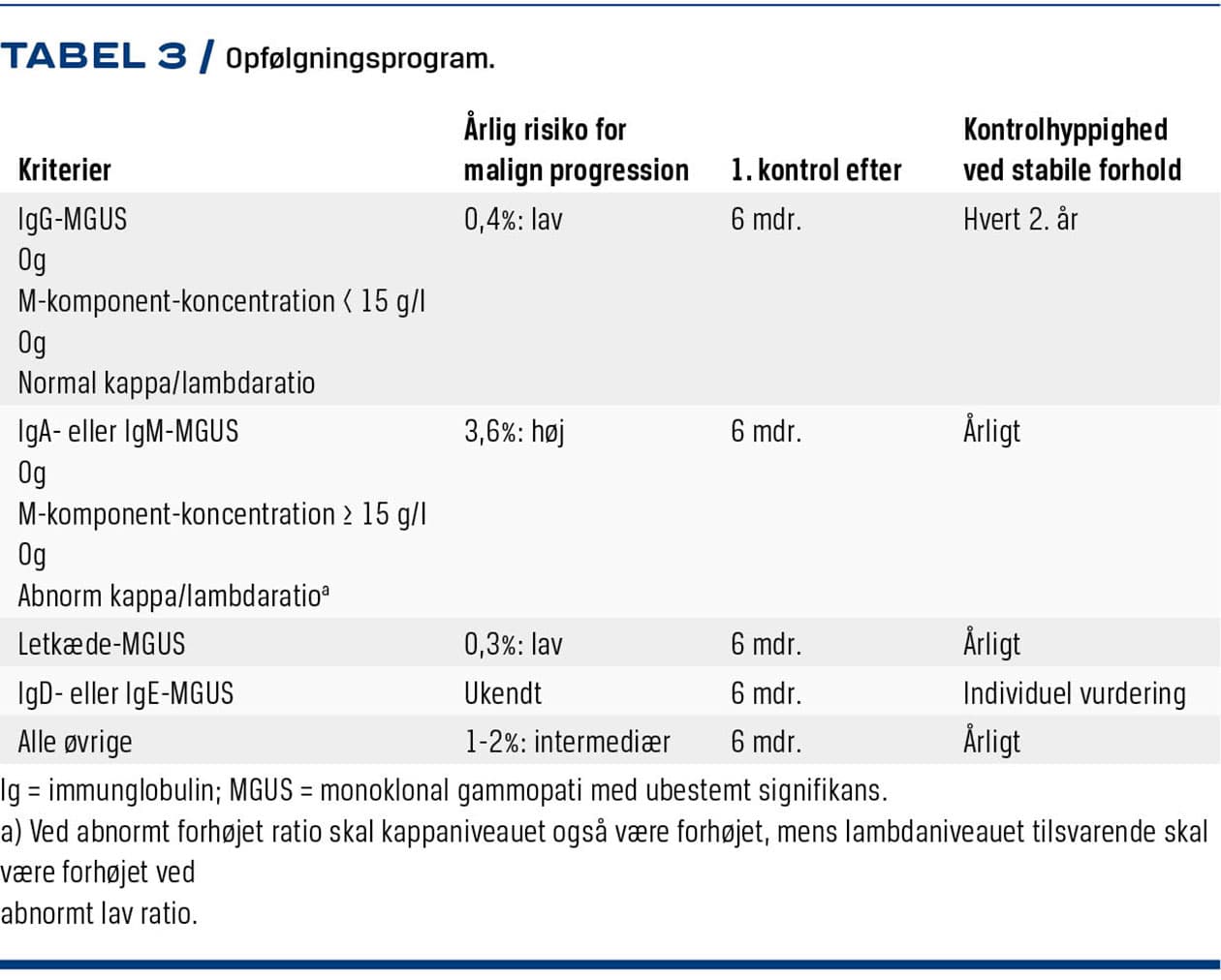 Patienterne bør møde til første planmæssige kontrol efter seks måneder og herefter som vist i Tabel 3. Ved opfølgning måles M-komponent i plasma samt hæmatologi, levertal, nyretal og ioniseret kalciumniveau. Ved letkæde-MGUS eller MGUS med høj letkædebyrde suppleres med måling af frie lette kæder i plasma samt EKG og UACR; de to sidstnævnte pga. øget risiko for kardiel og renal aflejringssygdom. Analyserne vurderes som ved udredning [5, 9].