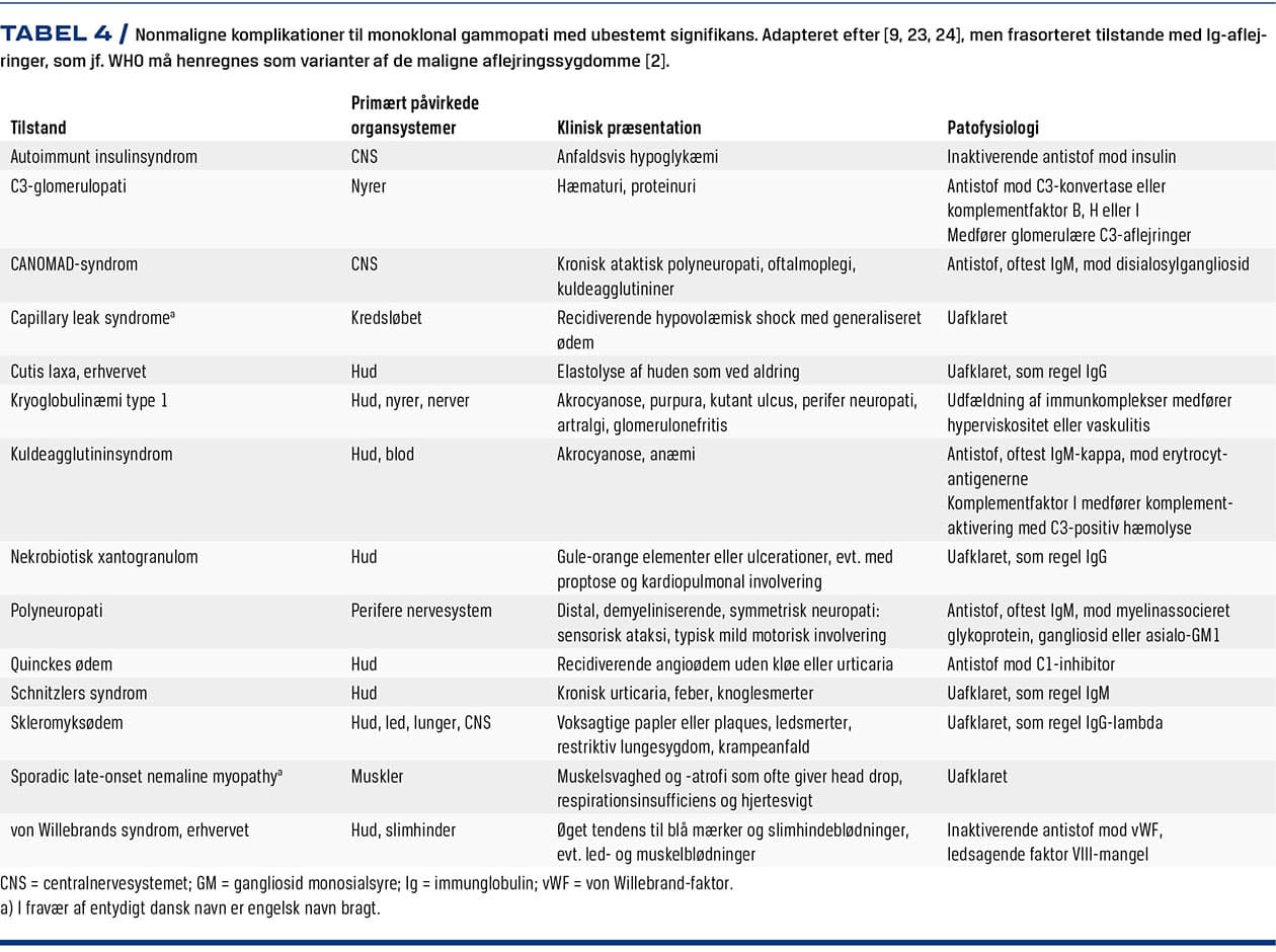 M-komponenten eller den monoklonale klon kan optræde vævstoksisk, uden at der er tale om malignitet. Disse nonmaligne komplikationer er ofte autoimmune, som vist i Tabel 4 [2, 9, 23, 24].