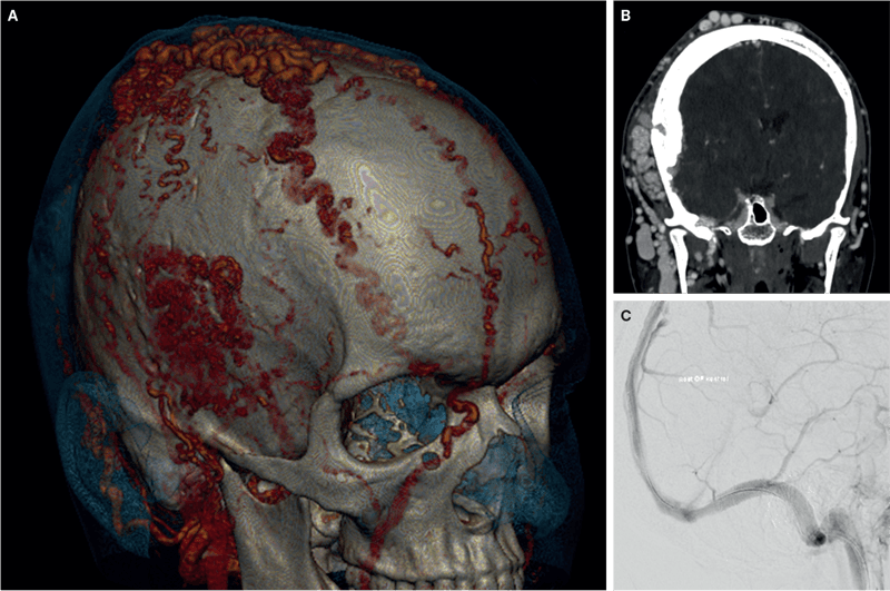 På grund af blød udfyldning på skalpen blev en asymptomatisk, 22-årig mand i august 2015 henvist til CT af cerebrum, der afslørede en monstrøs high-flow ekstrakraniel arteriovenøs malformation (eAVM) (A og B). Qua supplerende digital subtraktionsangiografi, der demonstrerede diskret højresidig intrakraniel involvering og anastomoser med a. carotis externa-grene bilateralt samt a. vertebralis og a. ophthalmica dxt, var der formodning om steal-fænomen (SF). Dertil var der fortykkede kranieknogler på højre side (B) som tegn på kronicitet med karakteristisk ukendt ætiologi [1, 2].